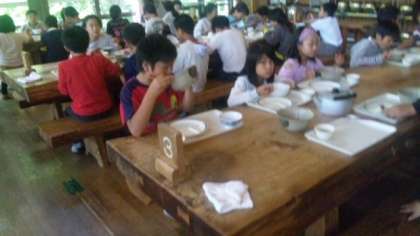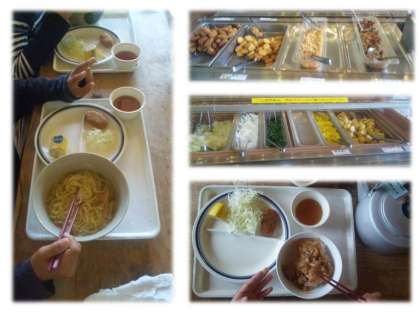 山の家での最終日の昼食は,食堂でのバイキングです。主食を「ラーメン」と「とりてり丼」から選び,サイドメニューをバイキング形式でとります。自由な昼食を満喫しました。