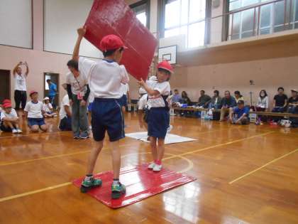 『バルーン』では,みんなで大きなバルーンを持って,回ったり,パタパタしたり,中に入ったりして,保護者の皆様も一緒に楽しみました。島に見立てた赤白のダンボール板を,交互に動かして進む『島わたりリレー』や,校長先生のお相撲さんを,静原小学校のお友だちといっしょに倒して進む『ハッケヨーイ・ドン!』など,楽しい競技もたくさんありました。一生懸命頑張ったので,ちょっと疲れた子どももいましたが,終わった後,「あー楽しかった」という言葉も聞かれました。来年も楽しみにして欲しいです。