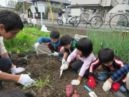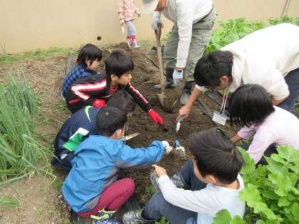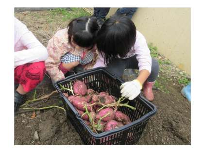 今日は,みんなで大切に育てたお芋を掘りました。土から少し見えているお芋のまわりを掘っていくと,大きなお芋が出てきて,みんな大喜びでした。お芋がたくさん採れたので,何を作るかみんなで話し合って,お芋料理をしようと思います。