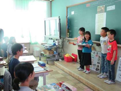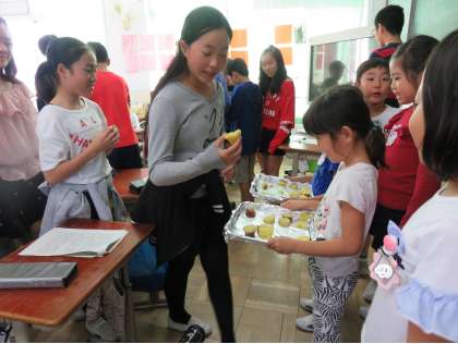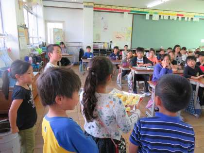 自分たちが食べた後は,いつもお世話になっている6年生に日頃のお礼を伝えに,おいもを持って教室にうかがいました。各クラス,代表の子どもたちがお礼の言葉を伝え,いもを配りました。6年生が喜んで食べてくれたことを,教室で待っていた友達にも教えてくれていました。自分たちだけでなく,6年生にも喜んでもらえたのがうれしかったようです。ふりかえりでは,さつまいもの植え方を教えてくださったり,いつも気にかけて畑の様子をみてくださったりした畑の先生にもお礼を伝えたいという意見も出てきました。