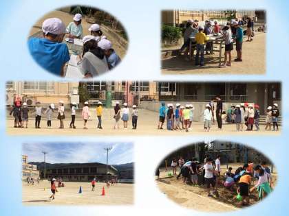 国語で学習する「ちいちゃんのかげおくり」でしょうか。みんなで輪になって手を繋ぎ,影送りをしているクラス。自分達で準備をしながらボールけりゲームをするクラス。ノートを囲んで,影の向きや長さを調べるクラス。
