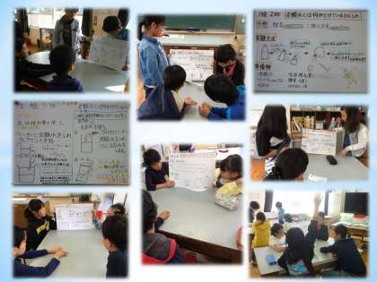 発表後の子ども達に感想を聞いてみると,「自分達では気付かなかったことを教えてもらえたので,実験方法を少し変えました。」「準備物に足りないものがあったので,付け足しました。」など,発表し合ったことで新たな課題に気付き,より良い方法を見付け出した班もたくさんありました。教科書通りの実験をすれば簡単なことですが,遠回りをした分,確実に自分事として学ぼうとしている子ども達。みんなで学び合うことの意味が,ここにあります。