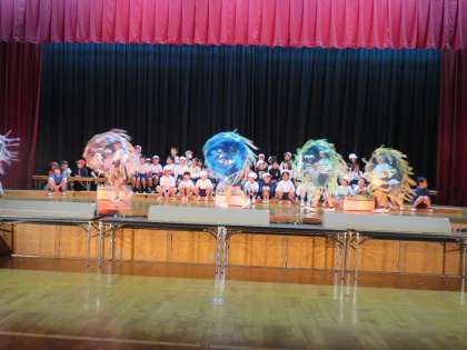 1年生の学習発表会は,「くじらぐも」です!国語で学習した「くじらぐも」を音読劇にして発表します。くじらぐも役,先生役,1年生の子ども役に加えて,けんばんハーモニカ隊,打楽器隊が登場します。くらげとイソギンチャクの身体表現もあります。1人1人の台詞があるわけではないですが,それぞれの役をがんばり,87名,心を1つにして「くじらぐも」を上演します。まだまだ練習中です。本番をお楽しみに!!