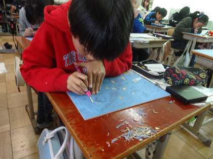 版画に取り組んでいます。彫り方を工夫して,すてきな作品にしようとがんばっています。どのような作品になるのか楽しみにしていてください。