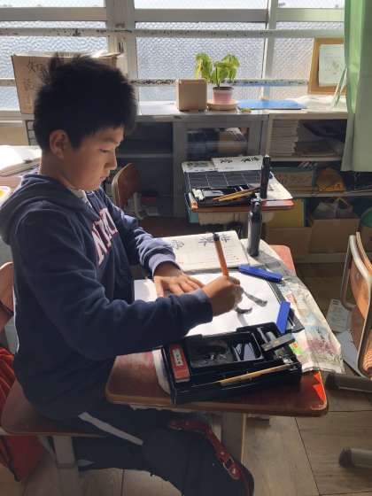 点画のつながりに注意して書きました。今回の書写は,『愛』という字です。みんな真剣に取り組んでいました。