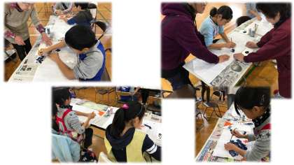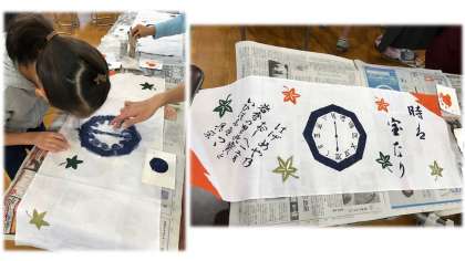 真っ白な手ぬぐいに,自分たちの手で「時は寶なり」という文字などをステンシルで染めていきます。子どもたちは,型を外してきれいに染め抜かれた文字や模様が出てくるたびに「お〜!」という歓声を上げながら,真剣に手ぬぐい作りにむかっていました。2時間ほどをかけて,全員の手ぬぐいが完成しました。