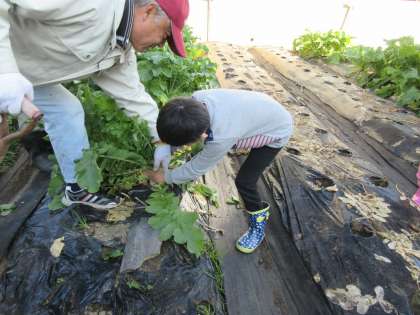 今日は,9月5日に種を蒔いた大根を収穫しました。大きいものは,土の上から見えるだけでも20cmくらいの大きさに立派に育っていました。畑の先生が,葉っぱをかき分けてくださり大きな大根が見えると,子どもたちから歓声があがりました。