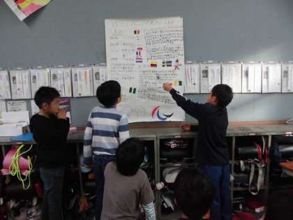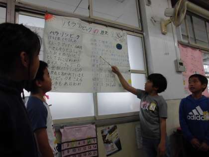 今日は,点字,盲学校,盲導犬,パラリンピック,ユニバーサルデザインなどそれぞれ興味をもったもののグループに分かれて,調べてまとめたものを発表しました。