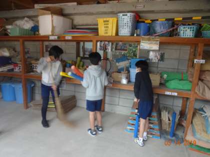 卒業までに学校をきれいにしようと取り組んでいます。今日は,体育倉庫を掃除しました。砂埃の中,重たい道具を運んで整頓しました。来年度の人たちが少しでも使いやすいようにしています。