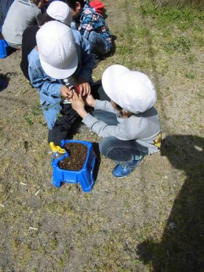 「大きくなってね。という気持ちを込めて植えようね。」という先生のお話を聞いて,子どもたちも真剣な表情で,優しく土をかけていました。早く終わった子が,上手に植えるコツを友達に教えてあげる姿もあり,うれしかったです。