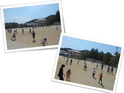 昼休みの校庭の風景。多くの子どもが元気に活動しています。異学年で遊んでいる姿も見られます。