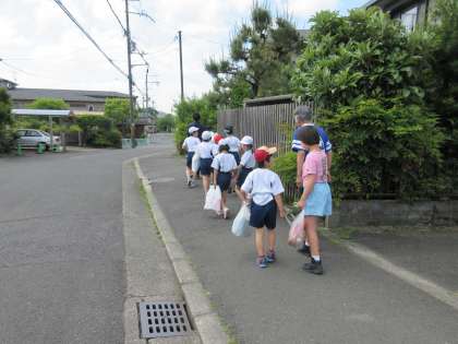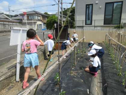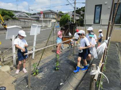 良い天気が続いているので,明徳農園の水やりを頑張っています。ペットボトルに水を入れて,靴と一緒に自分で運びます。苗にとって,水をやり過ぎても良くないと,畑の先生に教えていただいたので,残った水は,明徳農園の水がめに入れて帰ってきます。歩道を2列で歩くことも,随分上手になりました。