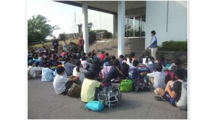 退館式です。2日目のはじめの活動,「うどん学校」にむけて出発しました。
