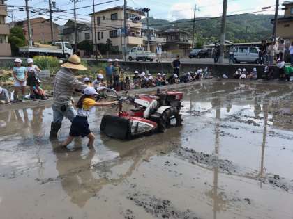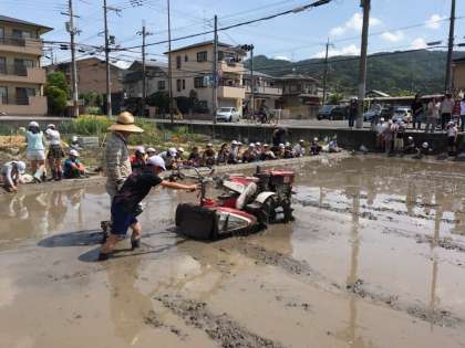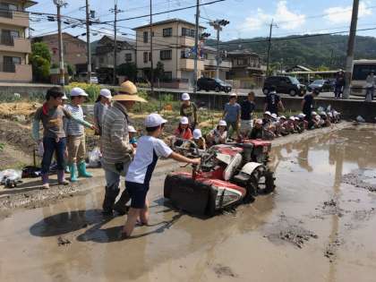 月曜日の「あぜぬり」に続き,今日は「本ごなし」を行いました。水と土をしっかりと混ぜ合わせていきます。各クラス1人ずつ,実際に機械を動かす体験をさせていただきました。見ているだけでは分からない難しさを体感し,泥だらけになりながら機械を動かしました。