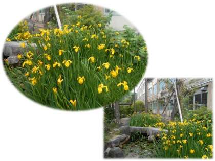 中庭の観察池に黄菖蒲が見事に咲き誇っています。鮮やかな黄色い花に,思わず足を止めて見入ってしまいます。緑のあざやか季節になりました。ここしばらくは,夏を思わせる日が続きました。修学旅行でも,こんぴらさんをのぼる子どもたちは汗だくでした。その後の昼食,だし醤油で食べるさぬきうどんがなんともおいしく感じました。