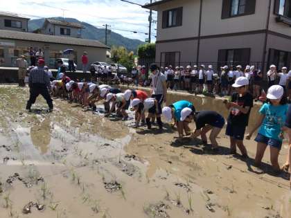 暑い中,たくさんの保護者の皆様にもお手伝いいただきました。ありがとうございました。畑の先生方には,朝早くから子どもたちのために水の管理や準備をしていただき,丁寧に田植えのご指導もしていただきました。本当にありがとうございました。