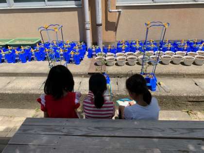 今日の2年生は,生活科の学習でミニトマトの観察を行いました。葉の形やくきの様子,花や実の色など,たくさんの気づきがあったようです。暑い中でスケッチしたり,一生懸命文章を書いたりする姿がとても輝いていました。これからのミニトマトの成長が楽しみです。