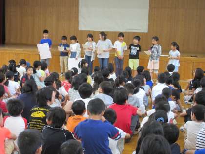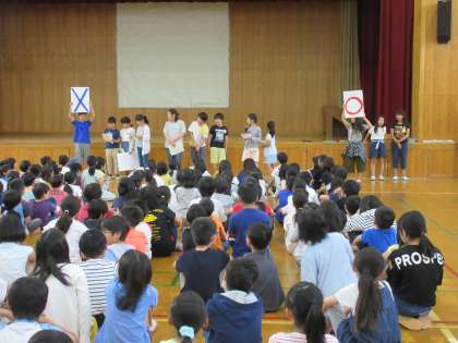 今日の中間休みに,飼育委員が体育館で中学年に向けて生きものクイズをしました。飼育委員のみんなが世話をしてくれているうさぎのクイズで,うさぎのことを知ってもらおうと今日に向けて考えてきました。そのかいもあって,参加してくれた中学年のみんなに楽しんでもらうことができました。明日は低学年に向けて頑張ります!