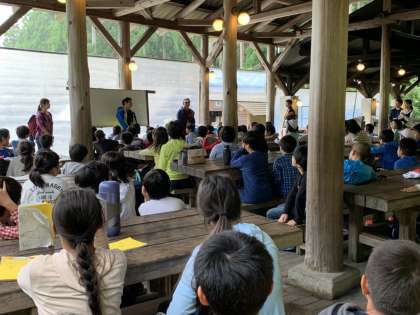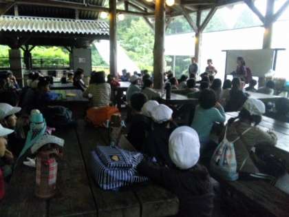 野外炊事の始まりです。はじめに所員の方から説明を聞いています。