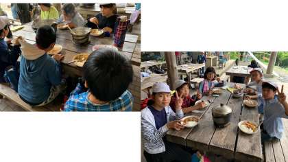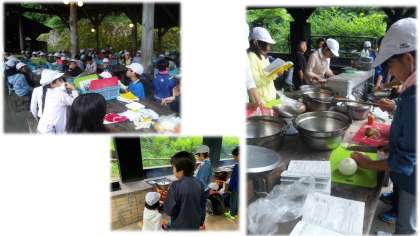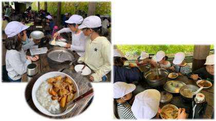 夕食のカレーができあがりました。予定通りにでき上った班,思いのほか時間がかかってしまった班,色々ありましたが,おいしさはどこも抜群だったようです。