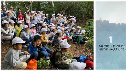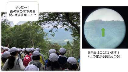 11時半頃,天狗杉登山の目的地に到着しました。ここからは,山の家が見えます。山の家で待機している木下先生に向かって「やっほ〜!!」「木下先生〜!!」と,叫びました。子ども達の声に応えて山の家から「やっほ〜!」と返した木下先生の声も,子ども達に聞こえたそうです。