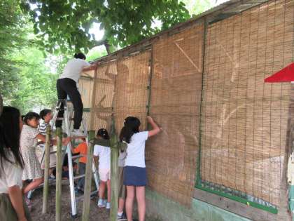 今日は,太陽が照りつける真夏に向けて,飼育小屋の夏支度をしました。小屋の中に陰ができるよう,みんなで飼育小屋の網にすだれを取りつけました。これで,ウサギたちも,少しは涼しく過ごせるのではないかと思います。