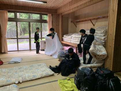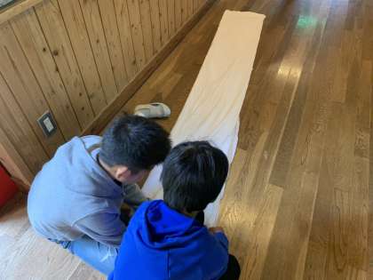 3晩お世話になったシーツを同じ形に整えてたたみます。大きいので一人ではできません。友達と声をかけあって協力してたたんでいます。