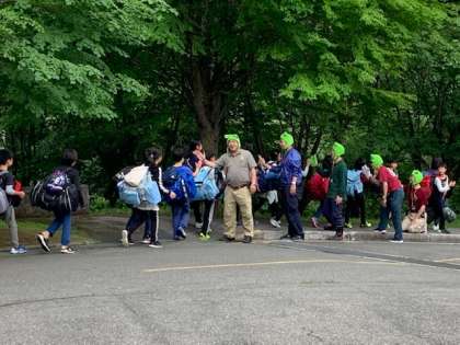 バスに向かうときには,山の家の所員の皆さんが,ハナコロの被りものをして見送ってくださいました。