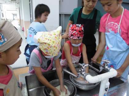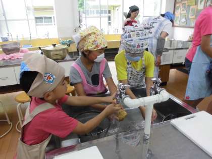 今日は,星の子学級の親子夏野菜カレークッキングの日でした。今年のカレーに使う野菜は,全て畑で収穫した野菜です。明徳農園で収穫したオクラ,ナス,ピーマンと,学校園で収穫したじゃがいもを使いました。