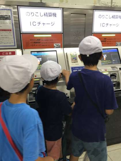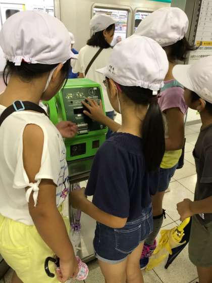 3,4時間目に国際会館駅へ行き,実際に点字がどんな風に使われているかを見に行きました。地下鉄の券売機や駅のホーム,エスカレーターなど,駅にはあらゆる点字が使われていることを確認することができました。また,普段よく目にしたり,利用したりしている自動販売機やごみ箱にも点字が使われていることに気が付くと,子どもたちは「ここにも点字があったなんて今まで知らなかった!」と驚いていました。