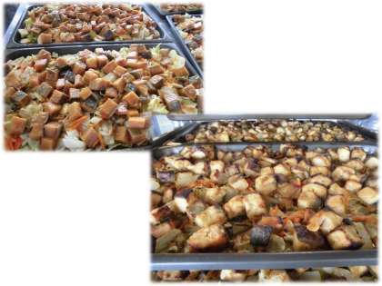 「さけのちゃんちゃん焼き」は,さけにみそだれをつけて,キャベツやにんじんなどの野菜といっしょにスチコンで焼きました。