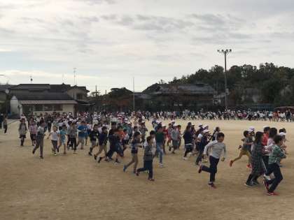 運動委員会の児童が準備をして放送を入れて,中間マラソンが始まります。ゆっくり歩いて身体をほぐし,7分間続けて走り,終わりに歩いて息を整えて終了します。
