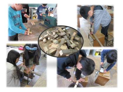 もう一つは,ウサギたちがかじるための“かじり木”作りです。ウサギは,木をかじらないと,前歯が伸びてしまいます。ウサギたちがかじりやすいように,木を短く切って立体的になるように麻紐でくくりました。