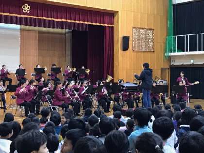 本日5時間目に,北稜高校吹奏楽部の生徒さんたちにご来校いただき,体育館で演奏会をしていただきました。吹奏楽らしい曲から演奏が始まり,楽器紹介や子どもたちに大人気のパプリカ,アラジンの曲を演奏してくださいました。特にパプリカでは,子どもたちも音楽に合わせて歌を歌ったり踊ったり…。子どもたちは,笑顔いっぱいで一生懸命聴いていました。また,6年生代表3名が指揮者体験をさせていただきました。緊張しながらも堂々と指揮をし,良い経験になったと思います。