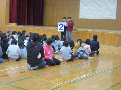 今日の中間休みは,給食委員会の皆さんが企画してくれた給食クイズでした。「ご飯は,食べ物の3つのはたらきのうち,赤・黄・緑のどの栄養の仲間でしょう?」という問題では,2学期に梅原先生から教えていただいたことを思い出して,「パワーンや!」と言いながら,黄を選んでいました。楽しいひと時を終え,手をつないで仲良く教室へ帰りました。