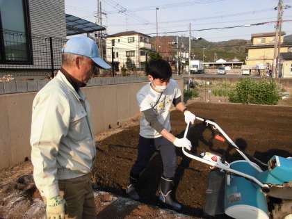 今日はよく晴れていい天気でした。畑の先生方にご指導いただいて,畑に肥料をまきました。昨年度末に雑草が生えないように貼っていたマルチを外し,色々な種類の肥料をまきました。畑の先生方の丁寧な指導の下,耕運機の動かし方も教えていただきました。固まっていた土が,ふかふかの土に生まれ変わりました。畝も出来上がり,土壌の準備が進みました。約1週間後,またマルチを貼る予定です。