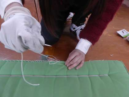 破れていたマットをタコ糸を使って補正していきます。体育の学習のときに安全に取り組めるようにしていきます。