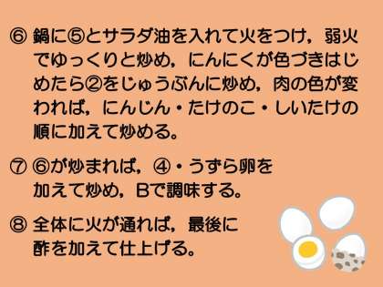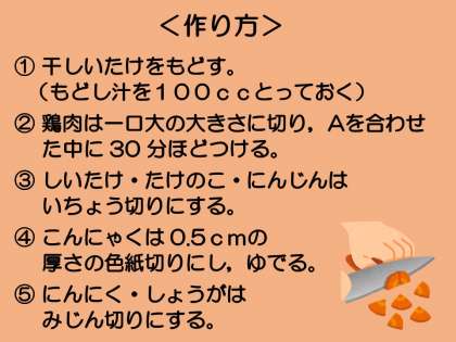 作り方です。火や油を使いますので,家の人と相談をしてから,作ってみるとか,そばで教えてもらいながら取り組んでみるとかしてくださいね。決して,自分の判断だけで取り組まないように,そして,調理をするときは,包丁や火,油など十分気をつけて安全面の確認も学習の一つとしてとらえてくださいね。