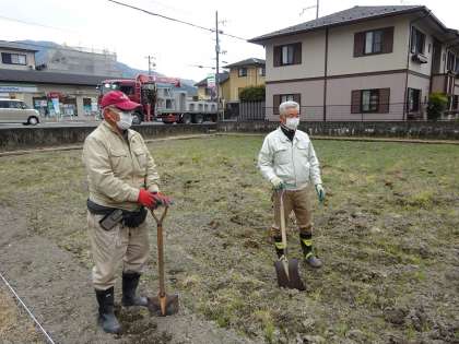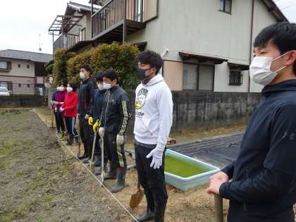 畑の先生に指導を受けて,先生たちみんなであぜきりをしました。みんなと一緒にしたかったですが,厳しい状況なので頑張って行いました。