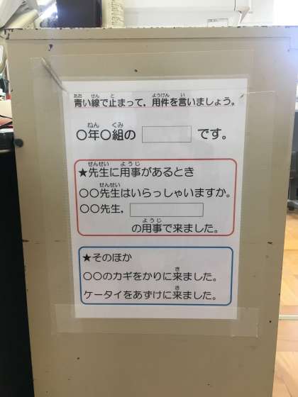 第一弾はこのお部屋!しょくいんしつです。このお部屋では,たくさんの先生がお仕事をしています。入るときにはルールがあります。これを読んで練習してみてね!
