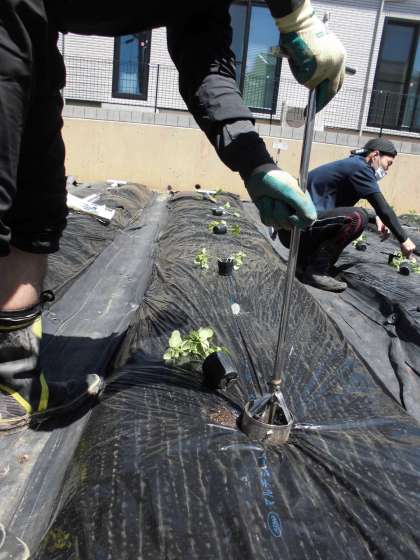 まず,マルチシートにまるい穴を開け,土を10cm程度掘ります。そこへ水を少し入れて,苗をそっと入れます。優しく土をかけて,水やりをします。そして,風で倒れないように,仮支柱(細い棒)を立てて,苗を紐で結びました。