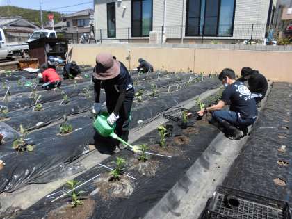 めいとく農園で,畑の先生と教職員で苗植えをしました。本来なら,児童のみなさんにやってもらう予定でしたが,代わりにやらせてもらいました。