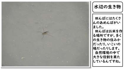 田んぼは生き物にとってすごい役割を果たしているんだなと思いました。気づかないだけでたくさんの生き物たちが待ちに待っていたのでしょう。