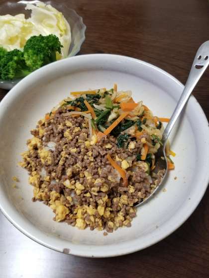 今日は,明徳小学校ホームページ5月11日の記事に載っていた『ビビンバ』に挑戦してみました。コチジャンが家になかったので,インターネットで調べて,家にある調味料で作りました。野菜を切って茹でておけば,あとは炒めるだけなので作りやすかったです。