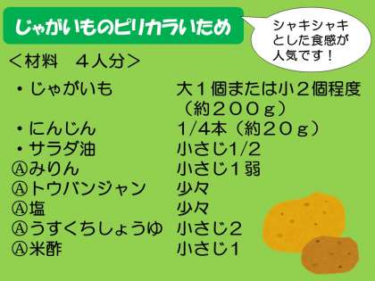 じゃがいものシャキシャキとした食感が人気です。冷めてもおいしい一品なので,お弁当のおかずにもぴったりです。作るときは,けがややけどに気をつけて,お家の人と一緒に作りましょうね。