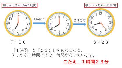 先週に出した時計の問題は解いてくれましたか。課題にも出していましたが,時計の問題は難しいですよね。しかし,時間や時こくの表し方を知れば,「あと○分でおわるから,つぎは〜〜しよう」というように,時間をうまく使うことができるようになります。分からないところがあれば,教科書を見たり,周りの人に教えてもらったりして,時計の問題を解くことができるようにがんばりましょう!
