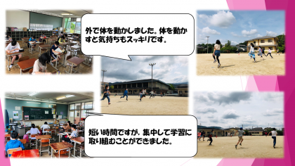 しっかり学習した後は,外で体を動かしました。広い運動場で思いっきり動くことは久しぶりでみんな楽しそうでした。