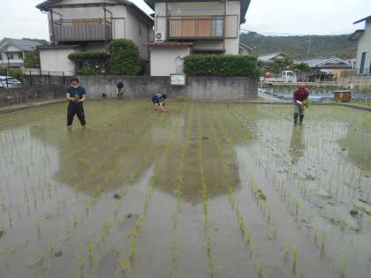 学年からのお知らせにもあるように,本日補植をおこないました。畑の先生方の助言の下,5年生の先生と畑の先生との連絡調整の窓口になっていただいている先生で,取り組みました。25日天皇陛下も皇居内の水田で田植えを行ったという報道もありました。岩倉の地域全体でも田植えが終わり,本格的な稲の成長を楽しみにする機会となってきました。社会は新型感染症の影響で,なかなか思うような活動はできませんが,作物は時期を逃すと生育できなくなります。こちらは確実に時の流れに沿って進んでいきます。