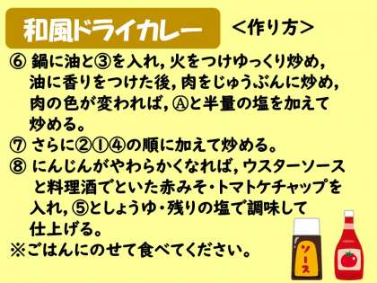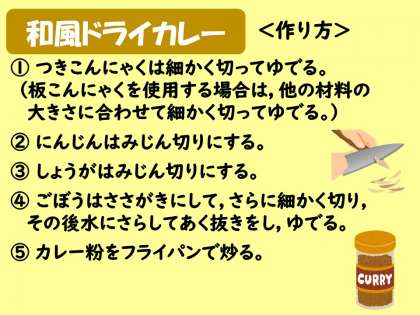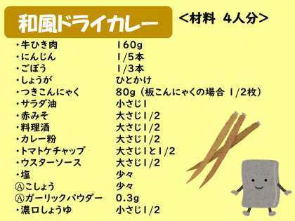 今回は,和風ドライカレーの作り方を紹介します。牛ひき肉・にんじんに,和の食材の,ごぼう・つきこんにゃくが入っていて,いろいろな食感が楽しめます。カレー粉やケチャップ,ウスターソースのほかに赤みそや濃口しょうゆを入れて和風の味つけにしています。お弁当にもぴったりの献立です。
