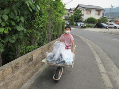 今日は,10本以上の2リットルのペットボトルに水を入れて,明徳農園まで一輪車で運び,サツマイモや夏野菜にたっぷり水をやりました。